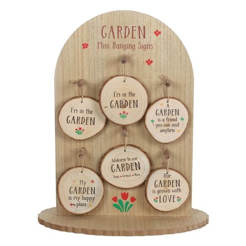This set of 30 small garden themed signs comes with a countertop display stand for effective merchandising. The set includes five different designs, each decorated with a floral pattern surrounding text which reads "I'm in the garden" / "A garden is a friend you can visit anytime" / "My garden is my happy place" / "Welcome to our garden. Love grows here" / "Our garden is grown with love".