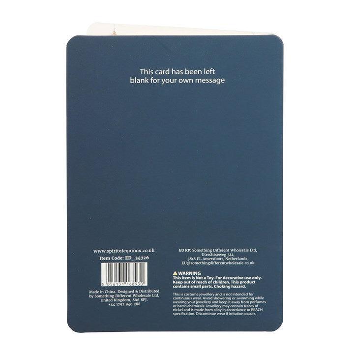 This dainty gold-tone stainless steel necklace features a turquoise Hand of Hamsa pendant and comes beautifully presented on a dark blue greeting card adorned with star accents and the words 'Seen, Guided, Protected'. Includes a matching turquoise envelope, making it a meaningful gift for any occasion. May contain traces of nickel and is made from alloy in accordance to REACH specification.