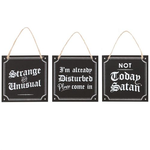 This collection of 12 gothic-themed mini signs are crafted from durable MDF. Featuring comical phrases making them perfect for adding a touch of dark elegance to home decor. Includes light brown rope for easy hanging and two of each design. Phrases include: x2 'Strange as usual' x2 'I'm already disturbed. Please come in' x2 'Not today, Satan' x2 'Sorry, we're goths' x2 'Live, laugh, loathe' x2 'Black is my happy colour'